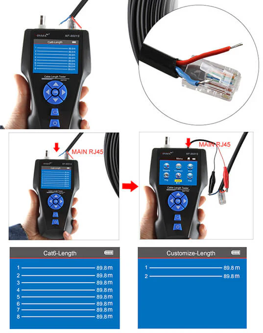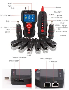 : ابزار حرفهای برای اندازهگیری طول کابل (TDR)، تست اتصال RJ45/RJ11/BNC، تشخیص PoE و تست شبکه — ایدهآل برای تکنسینها و نصابهای شبکه.