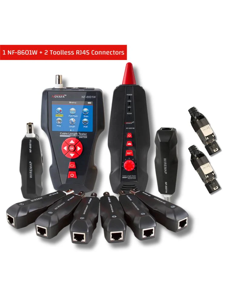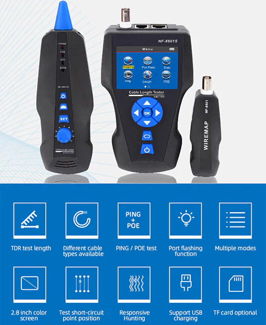 تستر کابل NF-8601W ابزاری حرفهای است برای تکنسینها و نصابهای شبکه که علاوه بر تست کابل معمولی، قابلیتهایی مانند اندازهگیری طول کابل (TDR)، تشخیص PoE و Ping و تست شبکه را نیز دارد. این دستگاه برای انواع کابلهای RJ45, RJ11, BNC و حتی کابلهای فلزی طراحی شده است.